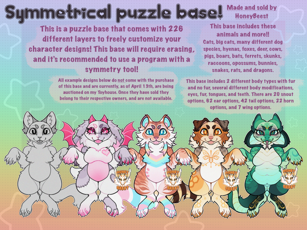 ➡️When buying this base, you receive my Symmetrical Puzzle base which comes with two different Body types + several eye, mouth, paw, ear, Tail, Fur/neck, horn, Wing, and more that you can mix-n-match. Be warned that this base does require you to erase linework, merge layers, possibly use several different PSD files on separate canvas's, erase lines, etc. as you put together the different options! The base is organized in groups for your convenience, and is easy to navigate!