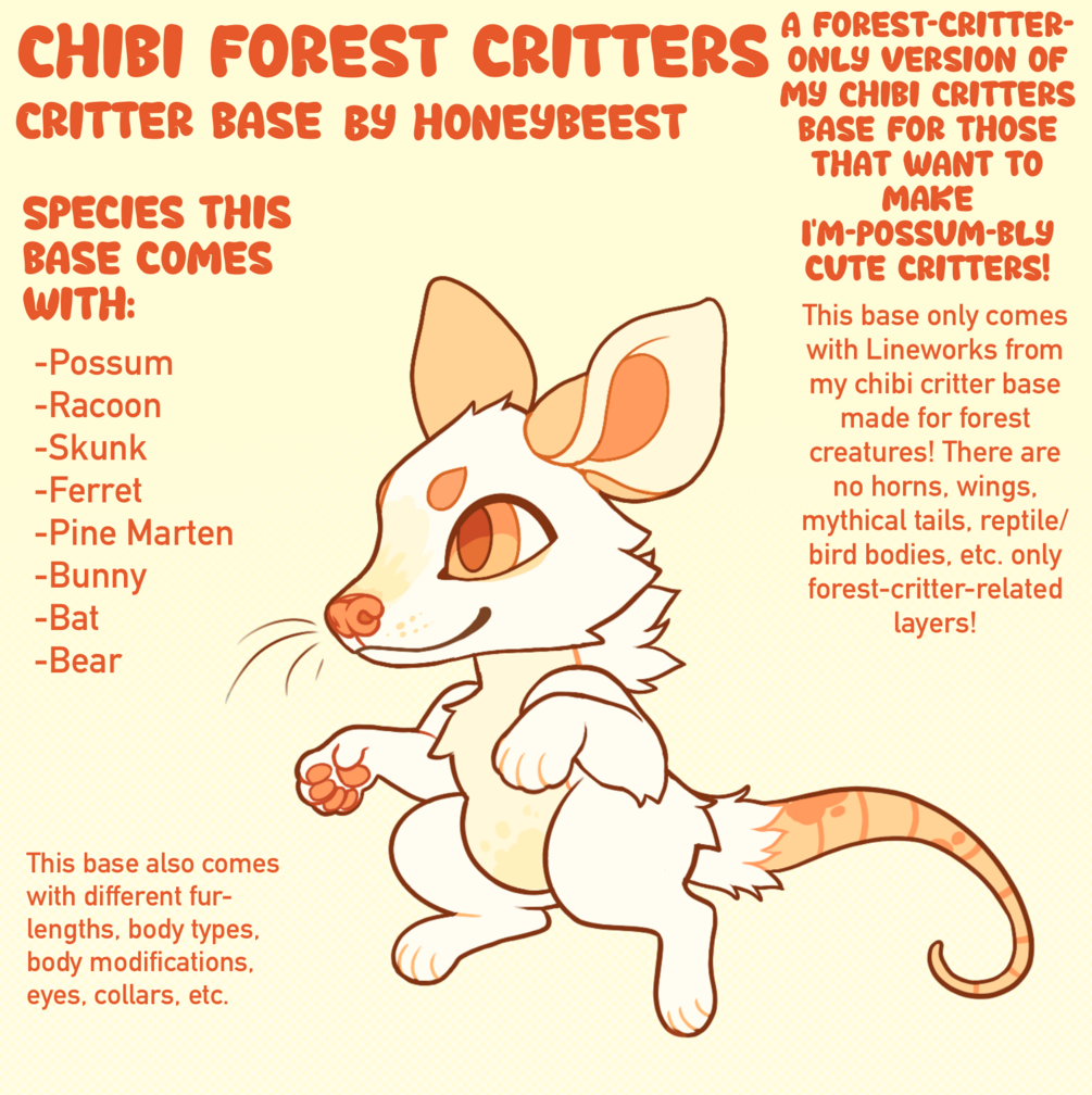 This is a smaller version of my Chibi Critters Base for those that prefer only making Forest Critter Designs! This Base ONLY comes with lineworks from my chibi critter base that was made specifically for Forest animals! There are no horns, wings, mythical tails, reptile/bird bodies, etc.