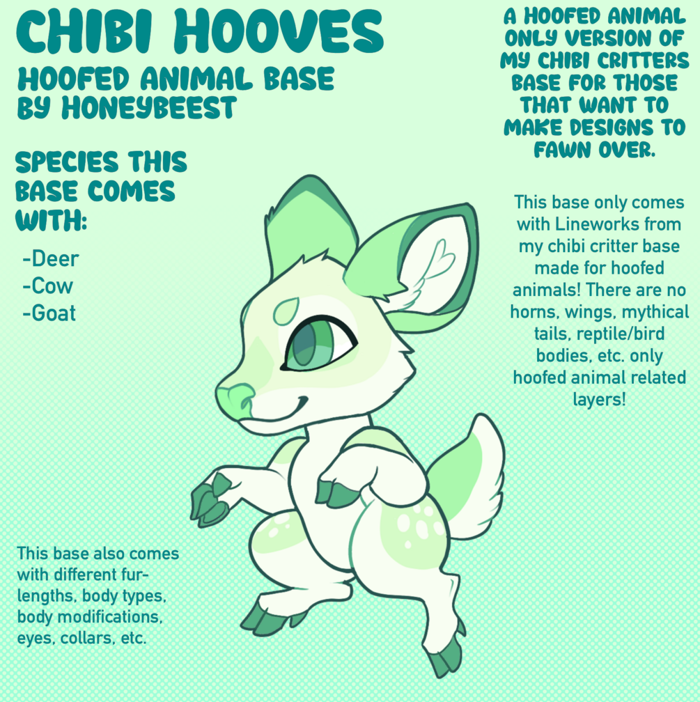 ➡️When buying this base, you receive my Chibi Hooves base which comes with several different Hoofed animal Body, head, eye, ear, Tail, Fur/hair, and collar options that you can mix-n-match. Be warned that this base does require you to erase linework, merge layers, possibly use several different PSD files on separate canvas's, etc. as you put together the different options! The base is organized in groups for your convenience, and is easy to navigate!