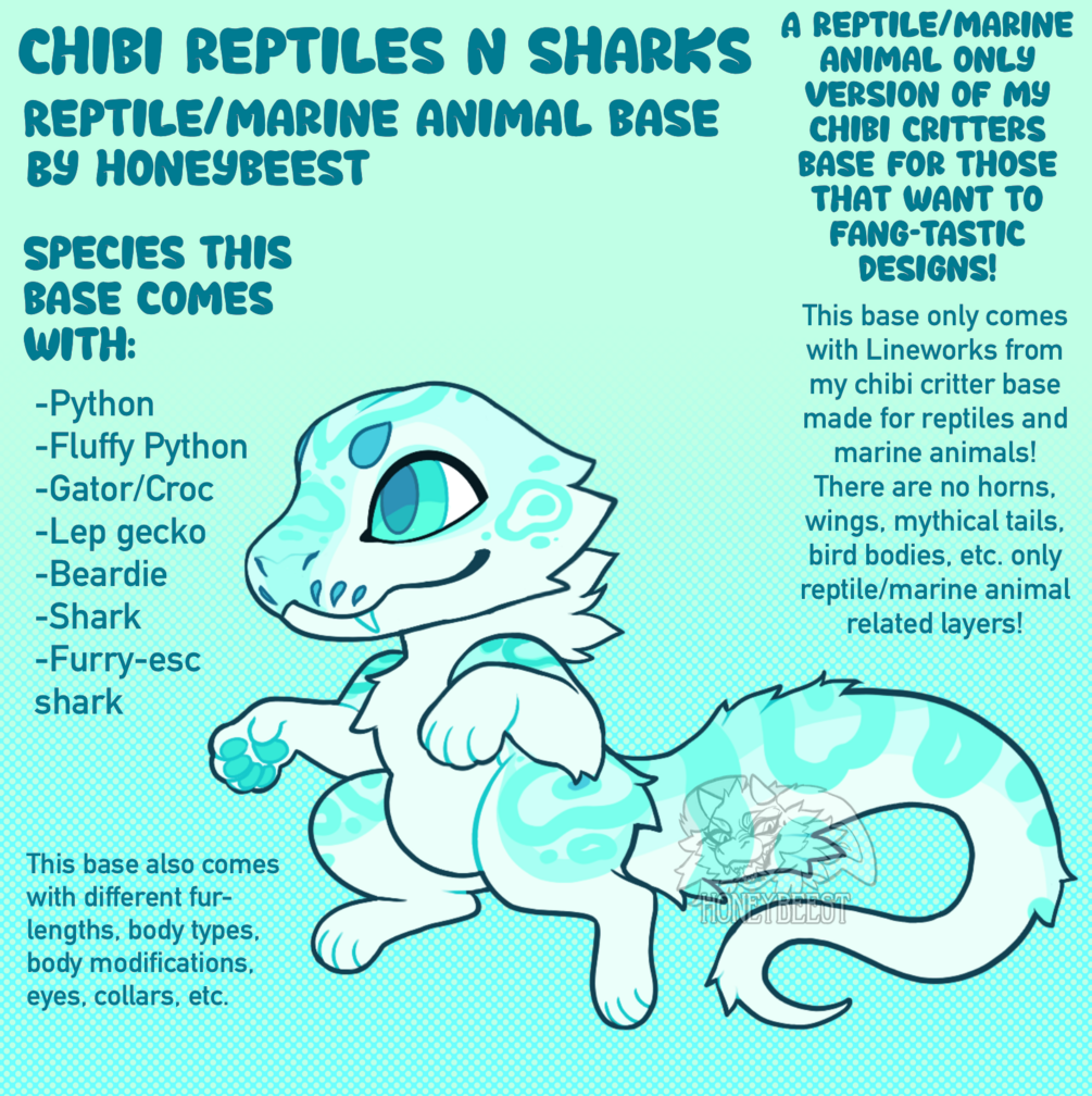 This is a smaller version of my Chibi Critters Base for those that prefer only making Reptile/Marine Designs! This Base ONLY comes with lineworks from my chibi critter base that was made specifically for Reptiles and Marine animals! There are no wings, mythical tails, bird bodies, etc. (You DO get options for fur! Furred Reptiles are absolutely possible with this base. There is ALSO some marine options, include shark heads, a Seal tail, Fish tails, etc.)